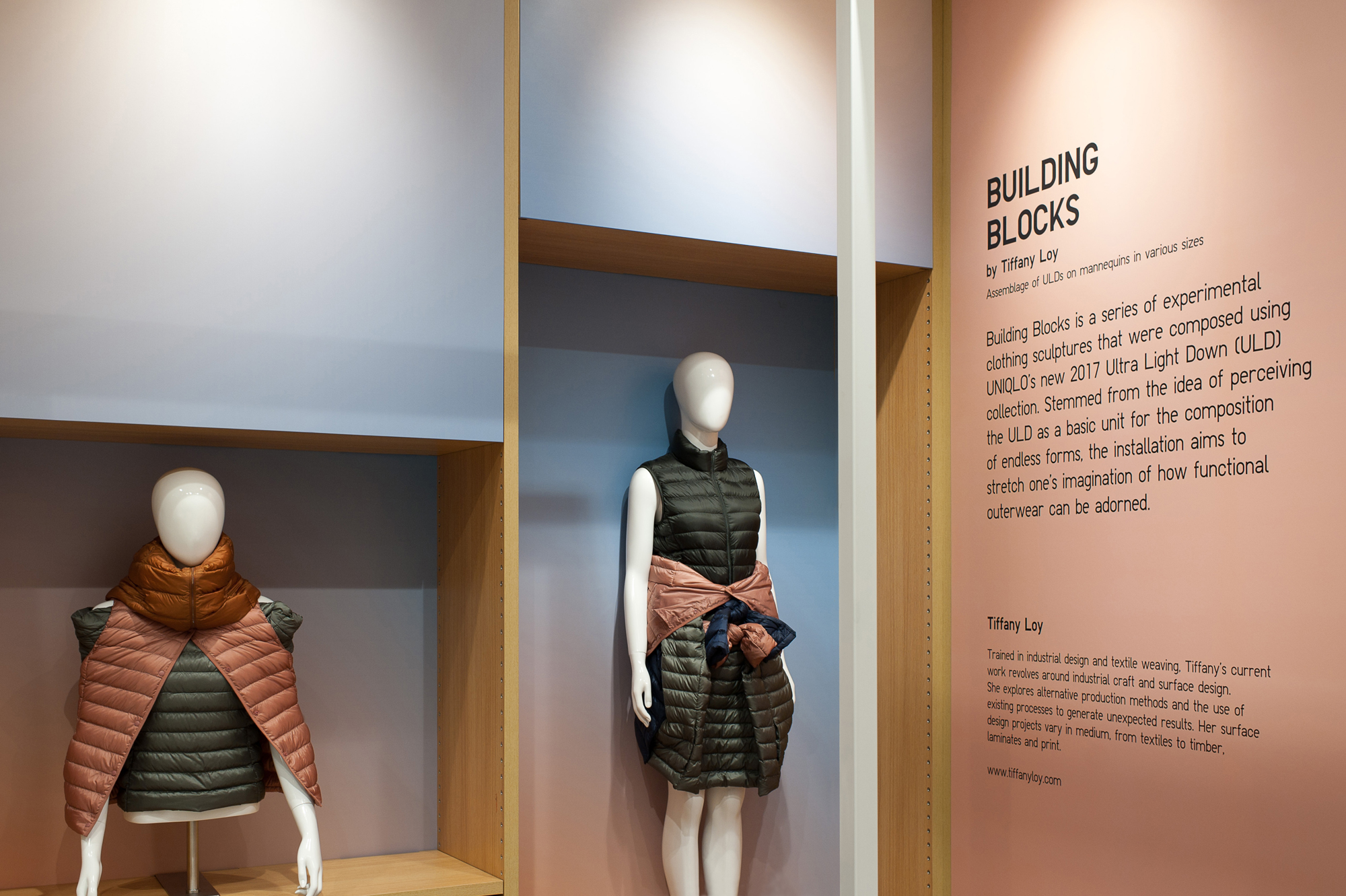 Building Blocks is a series of experimental silhouettes that were composed using UNIQLO's new 2017 Ultra Light Down (ULD) collection. Stemmed from the idea of perceiving the ULD as a basic unit for the composition of endless forms, the installation aims to stretch one's imagination of how functional outerwear can be adorned.