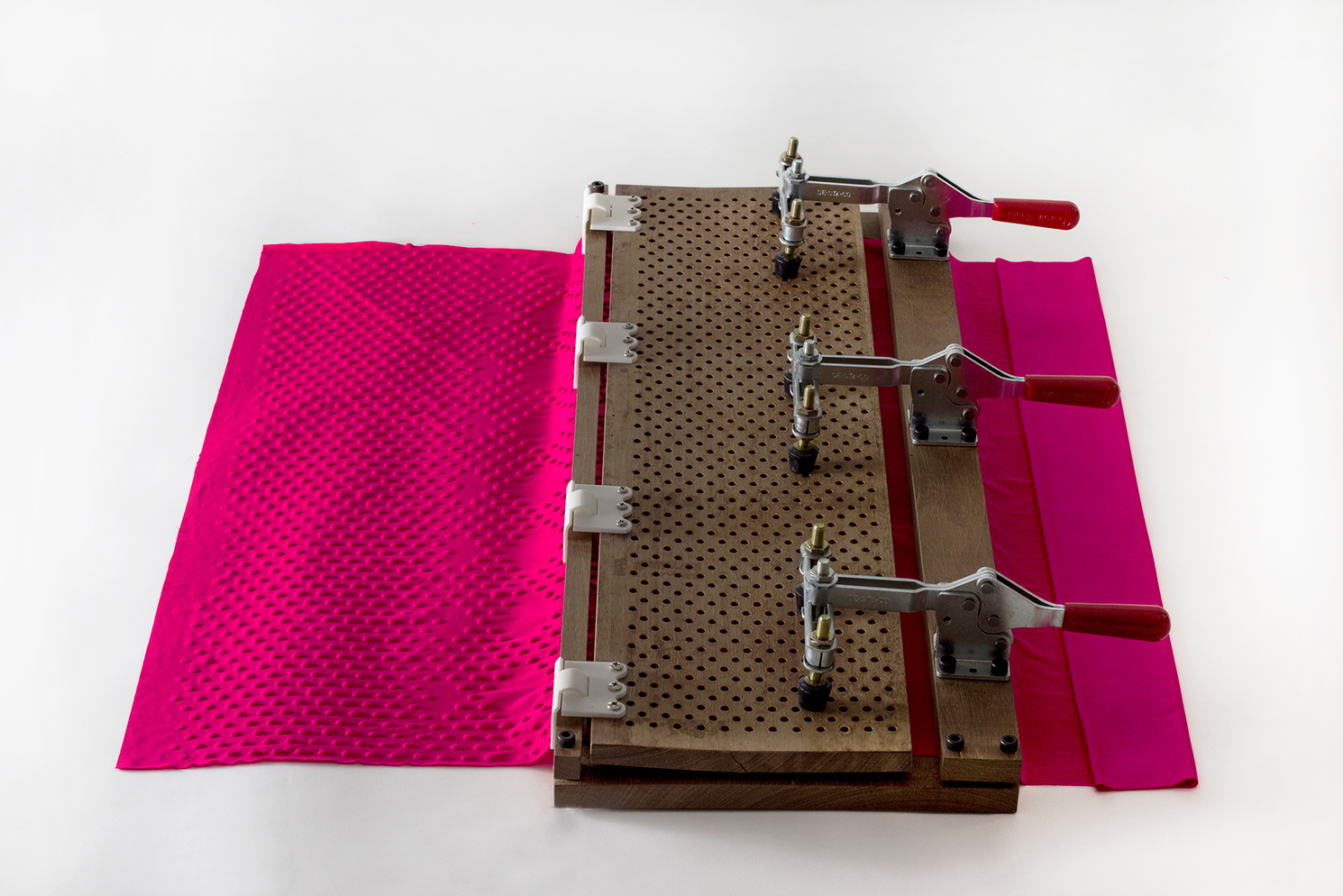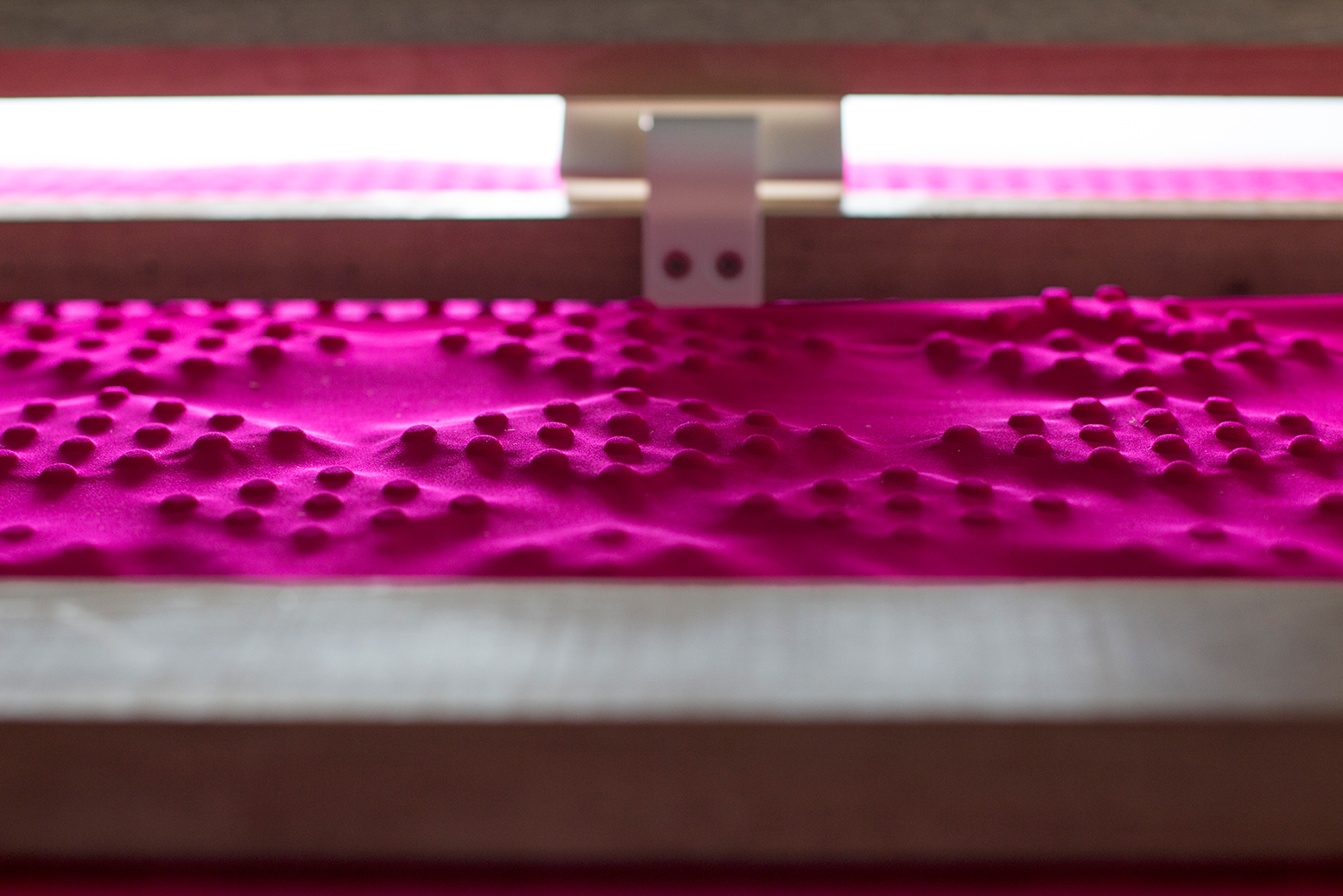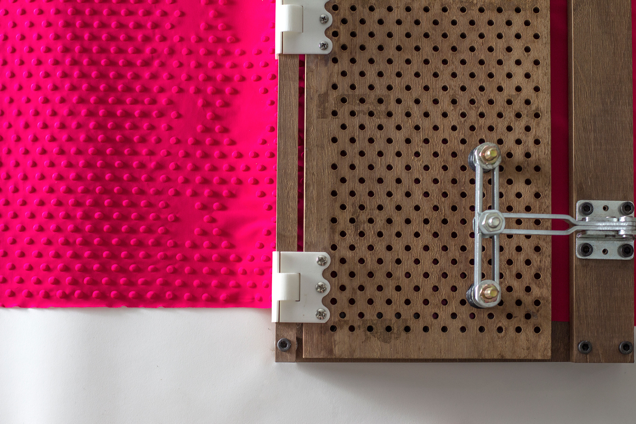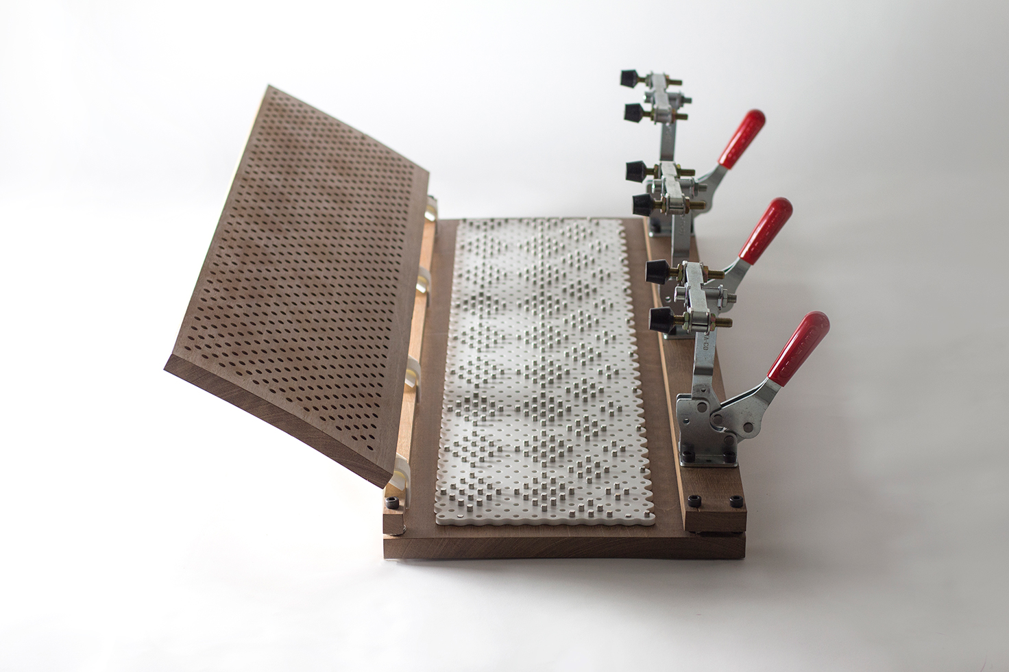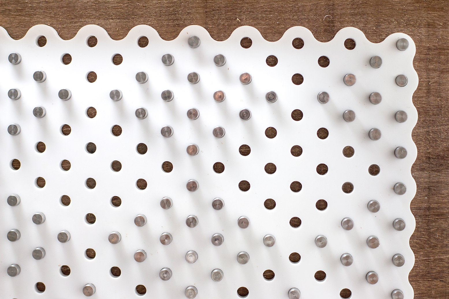 Stainless steel dowel pins in their pegboard base are rearranged to achieve a variety of patterns.